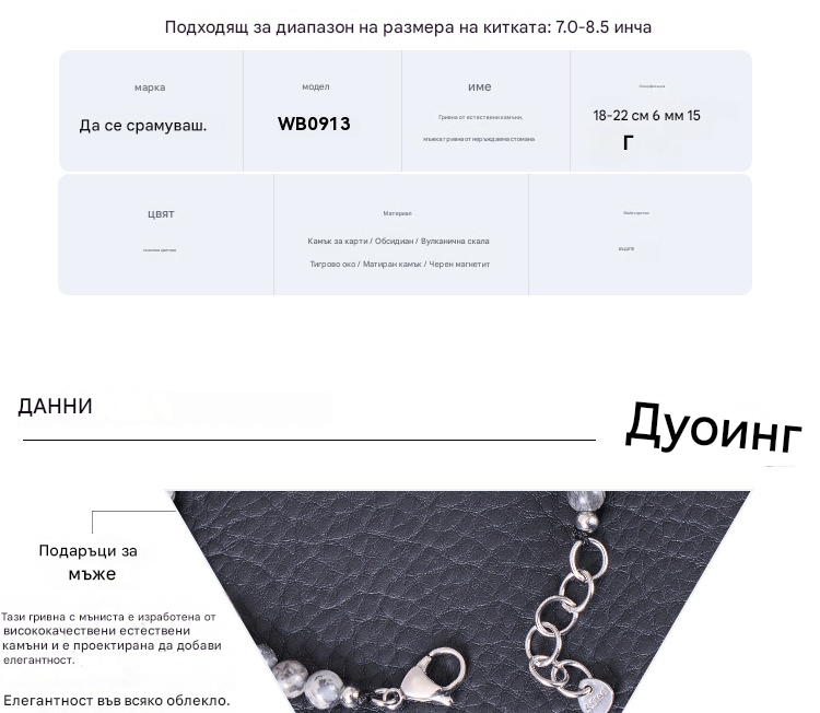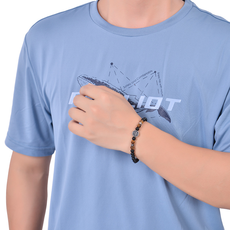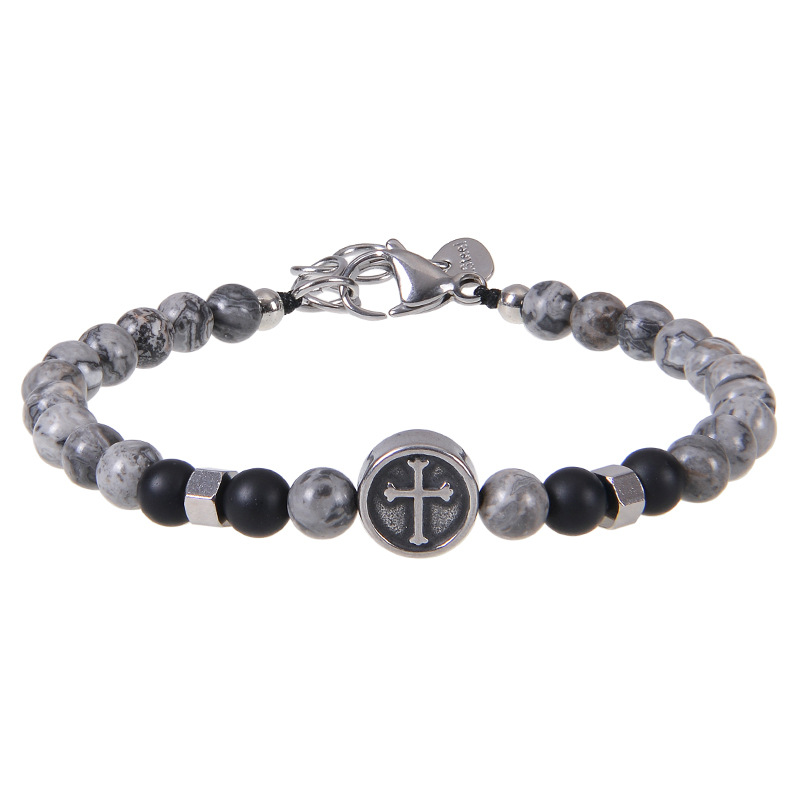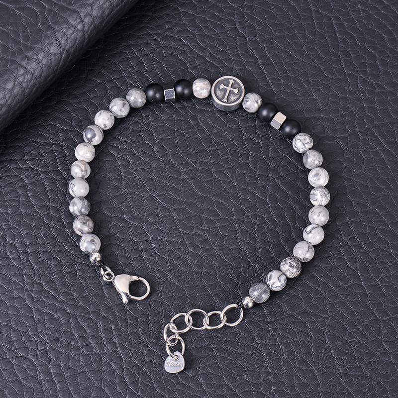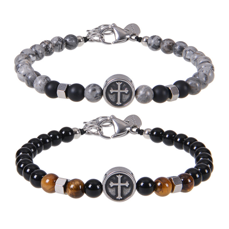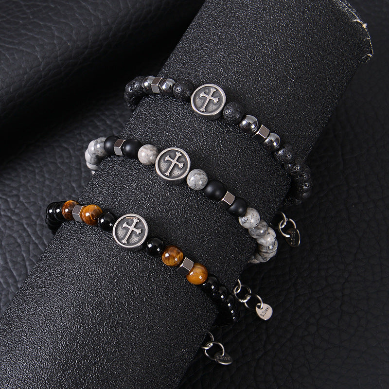 Винтидж мъжка гривна с кръст от неръждаема стомана, естествен камък и гривна с мъниста от обсидиан