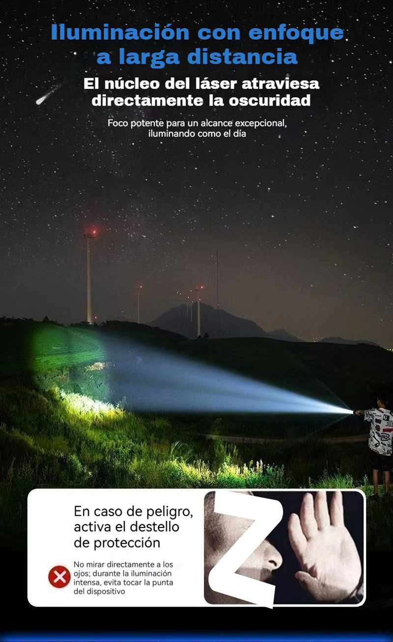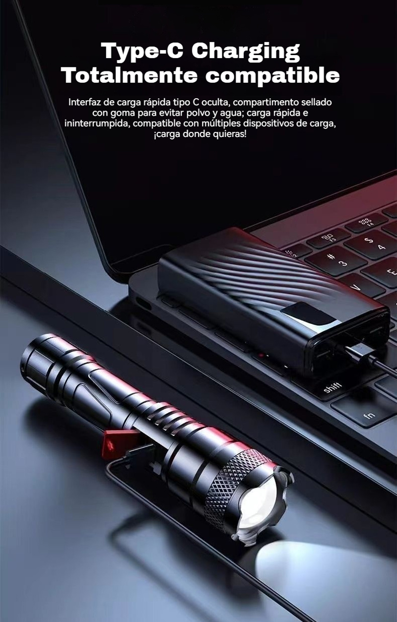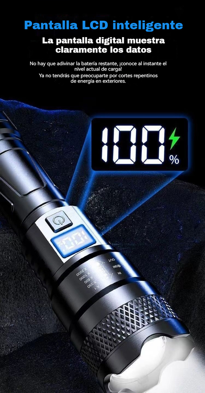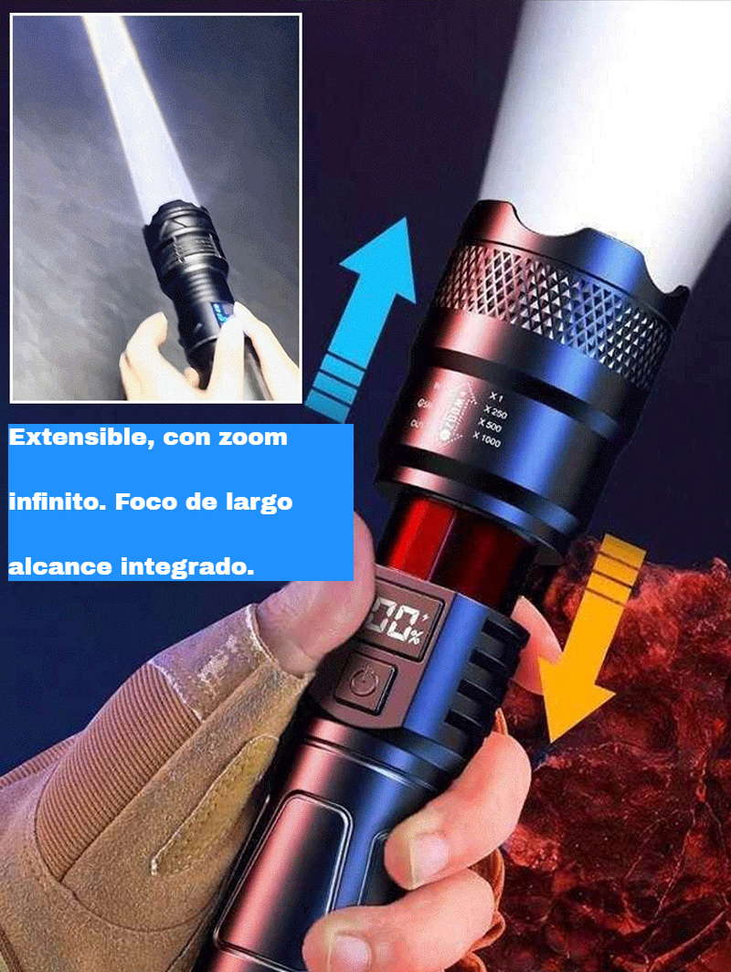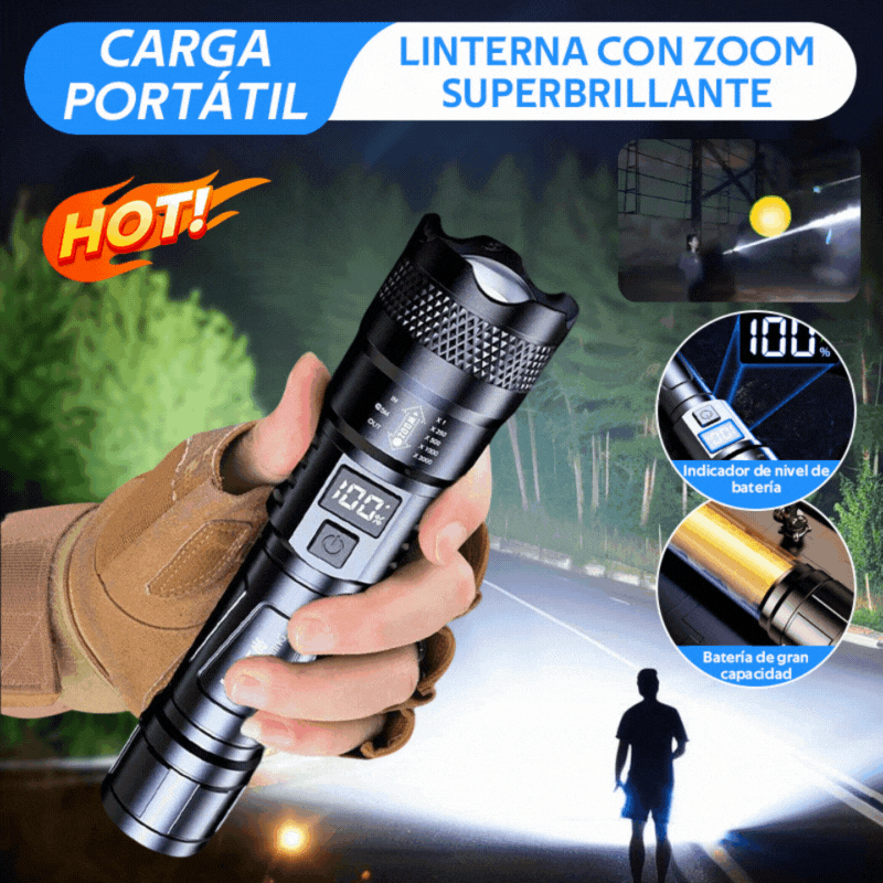 Мощен, презареждащ се преносим фенер за открито, супер ярък, с функции за увеличение и голям обхват.