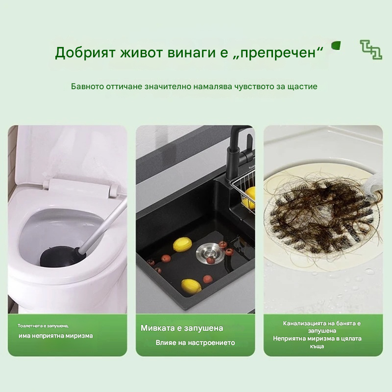 Ефервесцентен прах за почистване на канали - Мигновено разтваря мазнини и запушвания, премахва миризми и котлен камък, не уврежда тръбите, гаранция за връщане на парите