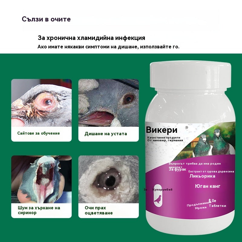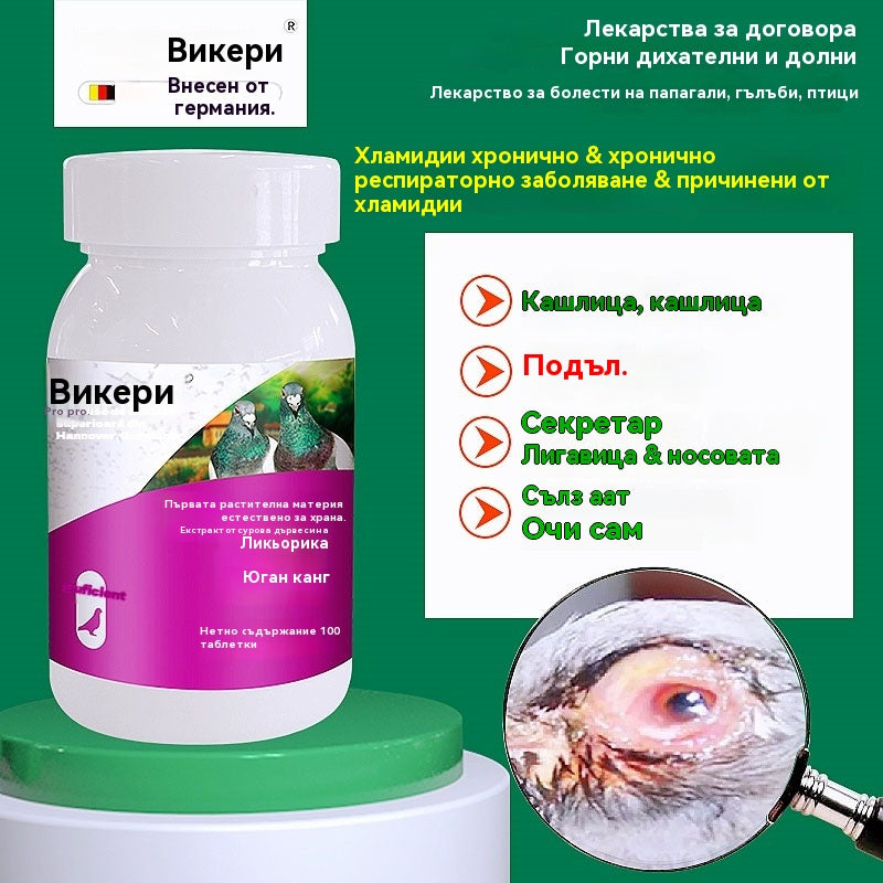 🕊️100 таблетки, специално лекарство за състезателни гълъби, кашлица и хрипове при състезателни гълъби, сълзене в едното око, замъглено зрение и трахома, черно-червено течение от носа