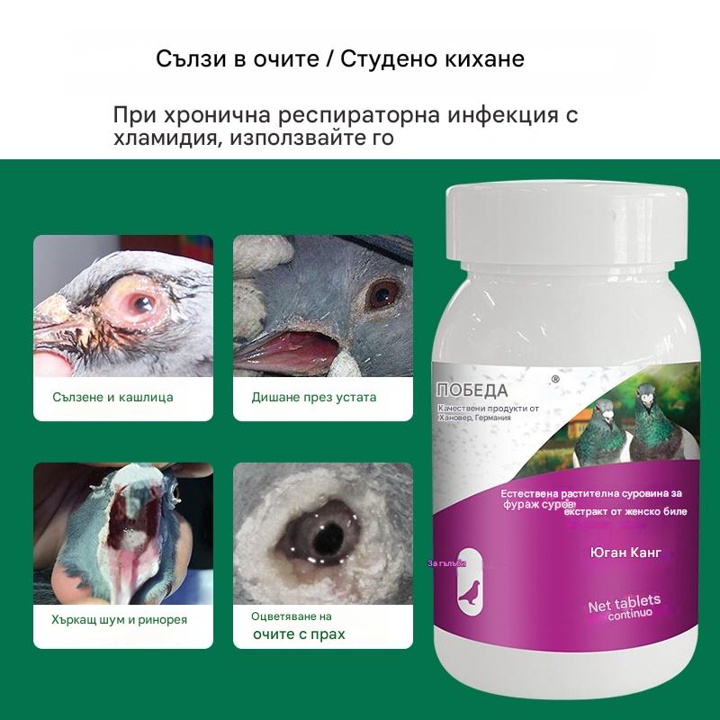 🕊️100 таблетки, специално лекарство за състезателни гълъби, кашлица и хрипове при състезателни гълъби, сълзене в едното око, замъглено зрение и трахома, черно-червено течение от носа